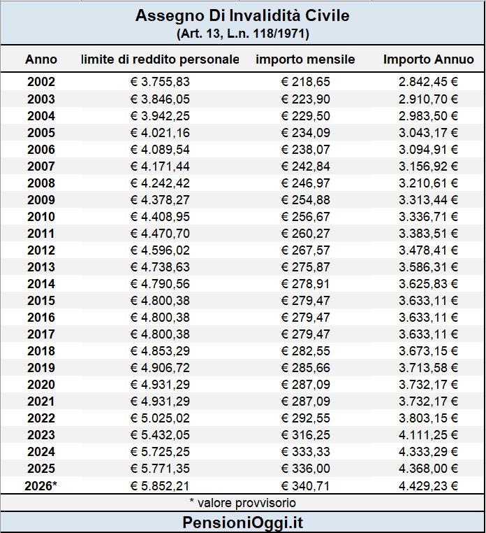 Dal 1° gennaio 2019 al 31 dicembre 2026 il beneficio può essere richiesto da soggetti che abbiano un'età compresa tra i 18 e i 67 anni. Dal 1° gennaio 2027 il requisito anagrafico sarà aggiornato in base all'andamento della speranza di vita ISTAT. La prestazione è concessa per 13 mensilità con decorrenza dal primo giorno del mese successivo a quello della presentazione della domanda per l'accertamento dell'invalidità, non è reversibile ai superstiti ed è pari, per il 2026, a 340,71 € al mese e non è soggetta al prelievo Irpef.