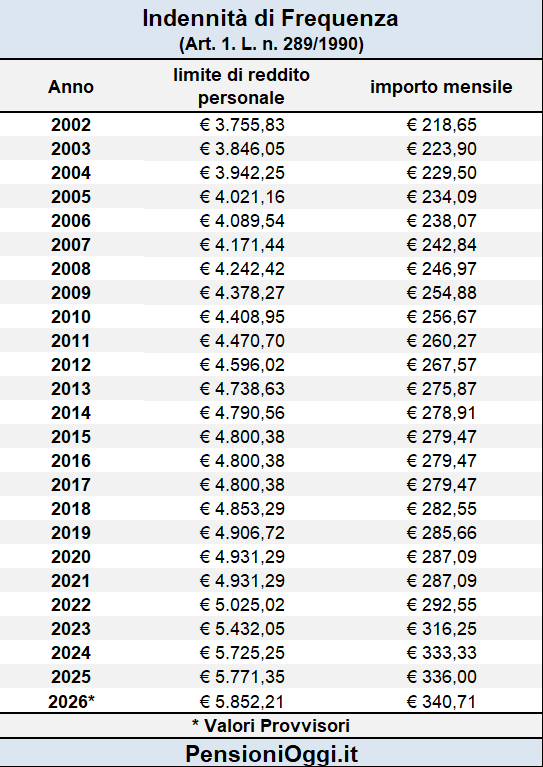La prestazione, a differenza dell'assegno di invalidità civile, è concessa sino ad un massimo di 12 mensilità annue con decorrenza dal primo giorno del mese successivo a quello di effettivo inizio della frequenza fino al mese successivo a quello di cessazione della frequenza. L'importo per il 2024 ammonta a 333,33€ al mese. Al pari dell'assegno di invalidità civile i beneficiari devono rispettare determinati limiti reddituali personali che, per l'anno 2024, non possono eccedere il valore di 5.725,25 euro. Sono valutabili i redditi di qualsiasi natura calcolati ai fini Irpef al netto degli oneri deducibili e delle ritenute fiscali con esclusione della casa di abitazione e del valore stesso dell'indennità di frequenza. L'indennità, se è soddisfatto il requisito reddituale, avviene sempre in misura piena.