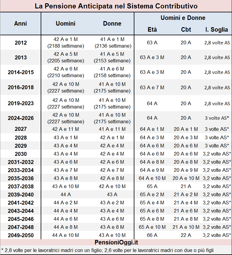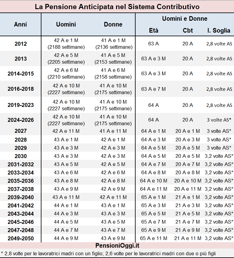 I requisiti contributivi utili per l'accesso alla pensione anticipata formano oggetto dell'adeguamento alla stima di vita Istat a partire dal 1° gennaio 2013. Il primo aumento è stato di 3 mesi; il secondo aumento, pari ad ulteriori 4 mesi, è scattato il 1° gennaio 2016; il terzo adeguamento, scattato il 1° gennaio 2019, è risultato pari a cinque mesi; il quarto, il quinto ed il sesto adeguamento, previsti rispettivamente con decorrenza 1° gennaio 2021, 1° gennaio 2023, 1° gennaio 2025 sono risultati nulli. Pertanto i requisiti sono rimasti invariati sino al 31 dicembre 2026 (cfr: Circolare Inps 63/2015). Il settimo adeguamento previsto per il biennio 2027-2028 sarà pari a tre mesi (cfr: decreto 30 novembre 2025) ma l'articolo 1, co. 185 della legge n. 199/2025 (legge di bilancio 2026) lo ha suddiviso in due aumenti: un mese dal 1° gennaio 2027 e di ulteriori due mesi dal 1° gennaio 2028.