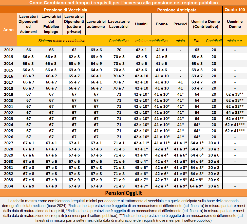 Innalzamento confermato anche dalla Riforma Fornero che, nell'art. 24, comma 12, della legge n. 214/2011, ha previsto che per tutti i requisiti anagrafici previsti dalla legge stessa per l'accesso attraverso le diverse modalità stabilite al pensionamento, nonché al requisito contributivo per la pensione anticipata, trovano applicazione gli adeguamenti alla speranza di vita.