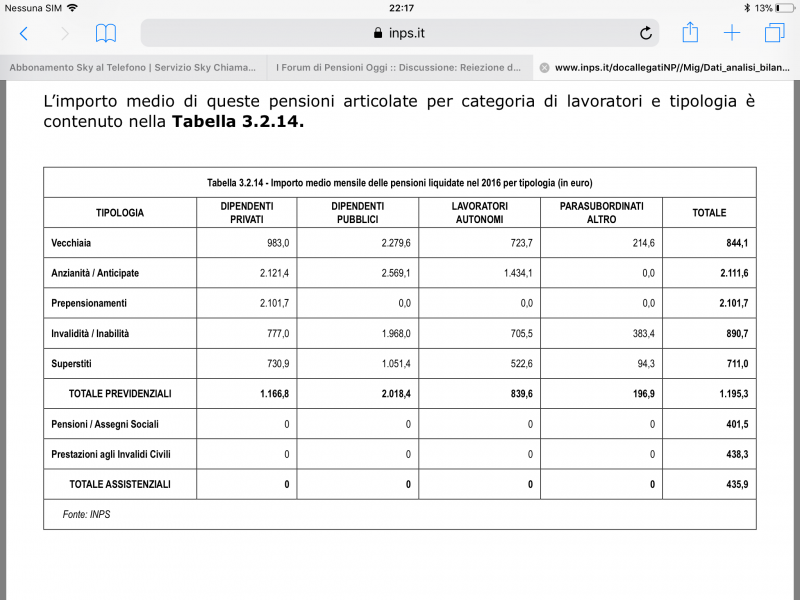 Non so se per il sig.Romado dopo 42 anni e 10 mesi di servizio presso l'amministrazione pubblica della marina militare come operaio agg.meccanico presso munizionamento navale,ricevere una pensione di 1.306 euro non è da ritenere una misera pensione. E ovvio che mi riferivo ai tanti che come me non fanno notizia nella funzione pubblica. Certo che fa rabbia anche a me notare questo ingiusto sbilanciamento di pensioni tra stessi dipendenti pubblici e settore privato.Ma, accolgo anche io l'invito del moderatore a chiudere qui la polemica. In punta di piedi tolgo il disturbo, pensavo di trovare più comprensione magari tra sfigati!