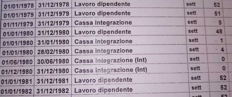 Salve, vorrei sapere se da un estratto conto INPS si posso ricavare gli effettivi giorni di lavoro non ai fini contributivi ma di effettiva presenza nel luogo di lavoro. Mi spiego meglio. Sto facendo una perizia relativa ad un lavoratore che è stato esposto ad amianto sul luogo di lavoro. Nell'estratto conto sono presenti i periodi in cui il lavoratore ha svolto le sue mansioni come latoratore dipendente ma vi sono anche dei periodi in cui il suddetto è stato in cassa integrazione. I periodi si sovrappongono e non so come conteggiarli. Ad esempio, considerando la tabella che ho allegato, nell'anno 79 il soggetto ha lavorato tutto l'anno ad eccezione del periodo che va dal 1/11/79 al 31/12/79 oppure ha lavorato 51 settimane meno le 5 segnate in cassa integrazione? A seguire, nell'anno 80, invece, i periodi di cassa integrazione si sovrappongono. Posso, quindi, in qualche modo, utilizzare questi dati per dedurne l'effettiva presenza sul posto di lavoro? Grazie