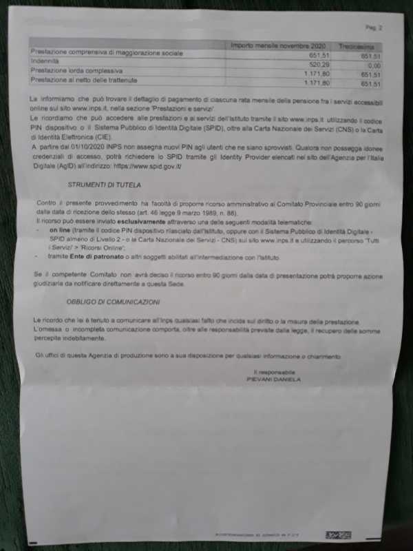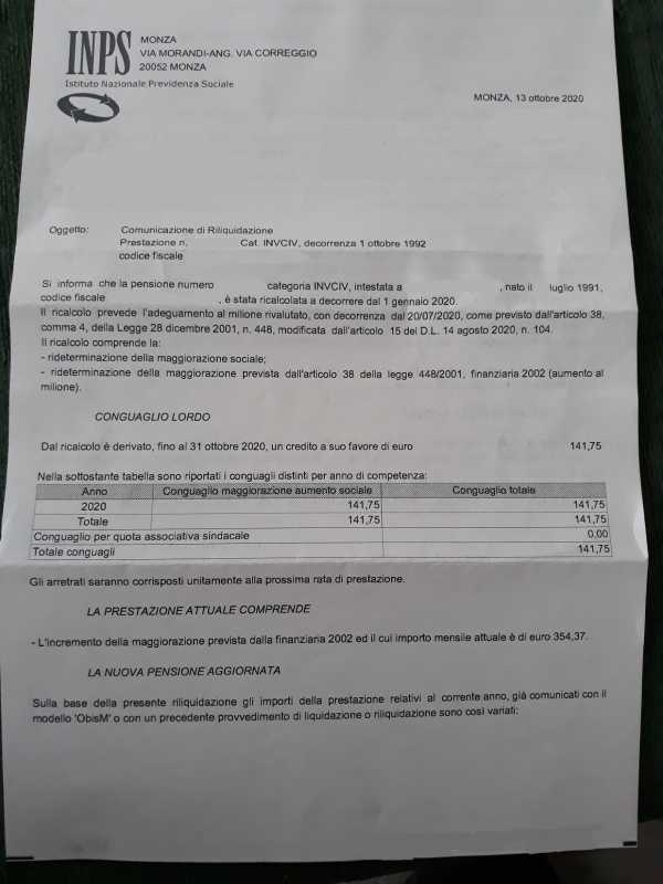 Dell'altro figlio invece (senza utente INPS, che chiederà sicuramente in futuro mia moglie in veste di tutore) è arrivata poco fa comunicazione scritta da INPS del ricalcolo pensione, con degli arretrati connessi ad altra legge che portano l'importo della pensione a 297,14 euro/mese a cui si aggiunge da agosto la maggiorazione sociale di euro 354,37 euro fino alla cifra perciò di 651,51.