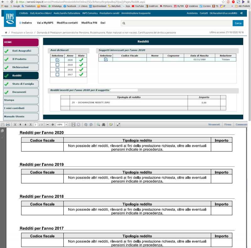 2) La domanda di Ricostituzione ha la parte Redditi da compilare. L'operatrice Inps di Legnano mi ha detto oggi di fleggare gli anni 2017-2018-2019-2020 e per tutti gli anni, compreso il 2020, di fare poi la scelta su "Non possiede altri redditi, rilevanti ai fini della prestazione richiesta, oltre alle eventuali pensioni indicate in precedenza" che è poi come mettere '0' nei redditi. Allego in merito una videata.