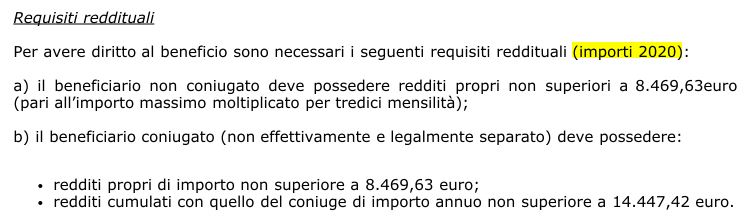 Per avere diritto al beneficio sono necessari i seguenti requisiti reddituali (importi 2020):