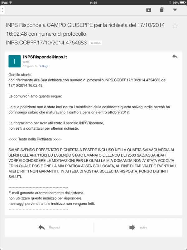 Se l'Inps non risponde è un problema, puoi comunque fare la simulazione della IV sul sito per vedere se rientri, a quel punto (se rientri) il più è fatto nel senso che se vieni escluso puoi accedere agli atti, chiedere il riesame della tua domanda. Al 31 ottobre i 2500 certificati (vale anche per CESY) erano in realtà 2463 o 2468 non ricordo bene.