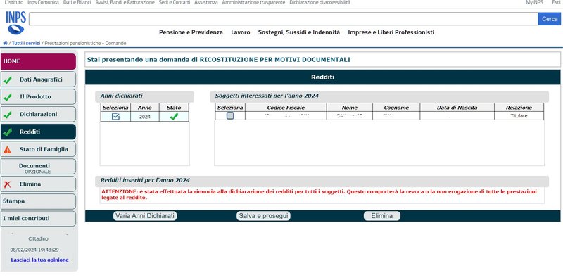 "ATTENZIONE: è stata effettuata la rinuncia alla dichiarazione dei redditi per tutti i soggetti. Questo comporterà la revoca o la non erogazione di tutte le prestazioni legate al reddito."