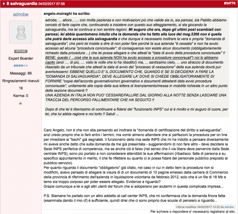 adrobe ha scritto: la feci io per sbaglio (la domanda di pensione di anzianità per salvaguardia) qualche giorno prima che aprissero la richiesta di certificazione del diritto a pensione da salvaguardia perchè avevo male interpretato un messaggio INPS di fine 2016...se ben ricordi ci fu anche una discussione con gli esperti di questo forum perchè i referenti INPS (sempre gli stessi di cui prima) mi dissero che andava bene e bastava quella, mentre qui mi dissero che non era valida per l'ottava salvaguardia e mi consigliarono di fare la domanda di certificazione vera e propria...cosa che fortunatamente feci contro il parere della Sede INPS...penso proprio che si riferiscono a questa, perchè sul mio portale, dopo essere stata per anni in lavorazione, oggi è stata classificata come RESPINTA