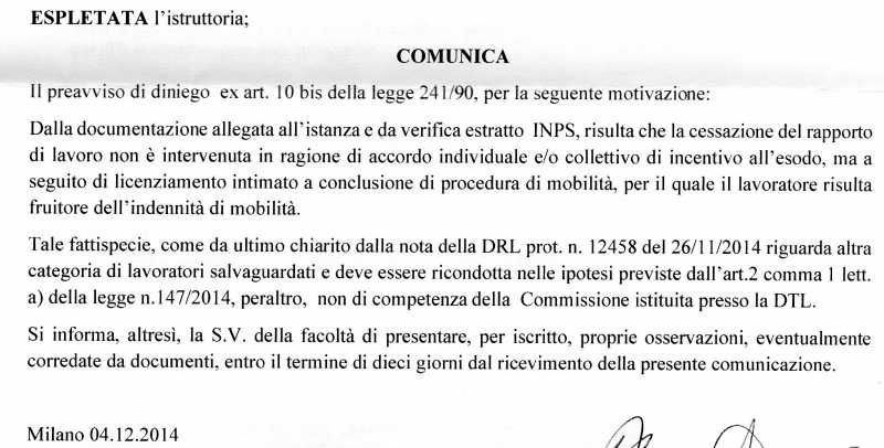 Ieri ho ricevuto, come già deve essere accaduto ad altri, la lettera di preavviso di diniego dalla DTL-Milano per l'istanza presentata per la 6a salvaguardia, lettera C (per la 5a, per la stessa tipologia, cioè cessato individuale, era stata accolta dalla stessa DTL-Milano, senza problemi). Riporto ciò che ha scritto Angelo Moiraghi sulla pagina FB degli esodati: