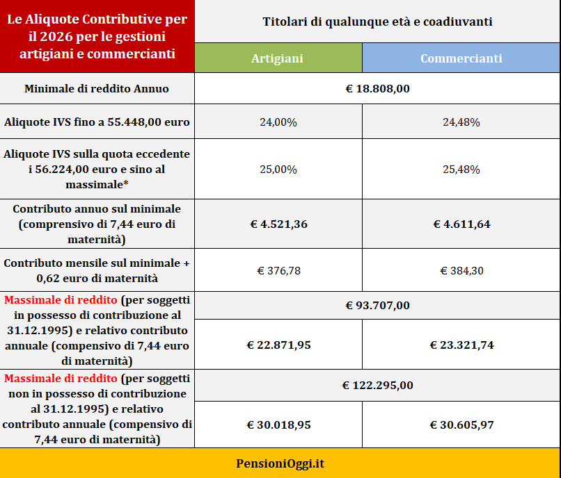Nel 2026 l'aliquota contributiva è pari al 24% per gli artigiani e del 24,48% per i commercianti. Anche quest'anno continua a trovare applicazione - previa domanda dell'interessato - la riduzione del 50% dei contributi nei confronti degli autonomi con più di sessantacinque anni di età, già titolari di pensione a carico dell'istituto.