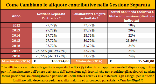 Nulla viene modificato con riferimento ai collaboratori ed altre figure assimilate non titolari di partiva iva. Da quest'anno tali figure subiranno un ulteriore incremento di un punto percentuale dal 31 al 32 per cento in vista del progressivo raggiungimento del 33% nel 2018 come previsto dalla Legge Fornero. L'obiettivo di fondo nel futuro, sarebbe la piena parificazione del lavoro parasubordinato a quello dipendente con l'estensione delle relative tutele. Chi invece è già iscritto ad altro fondo obbligatorio, ovvero è titolare di pensione, continuerà a versare, sia se parasubordinato o titolare di partita iva un contributo del 24% sul reddito annuo prodotto. Minimali e massimali restano quelli dello scorso anno dato che l'inflazione è risultata pari a zero. Il massimale contributivo sarà pari a 100.324 euro mentre il minimale risulterà pari a 15.548 euro annui.