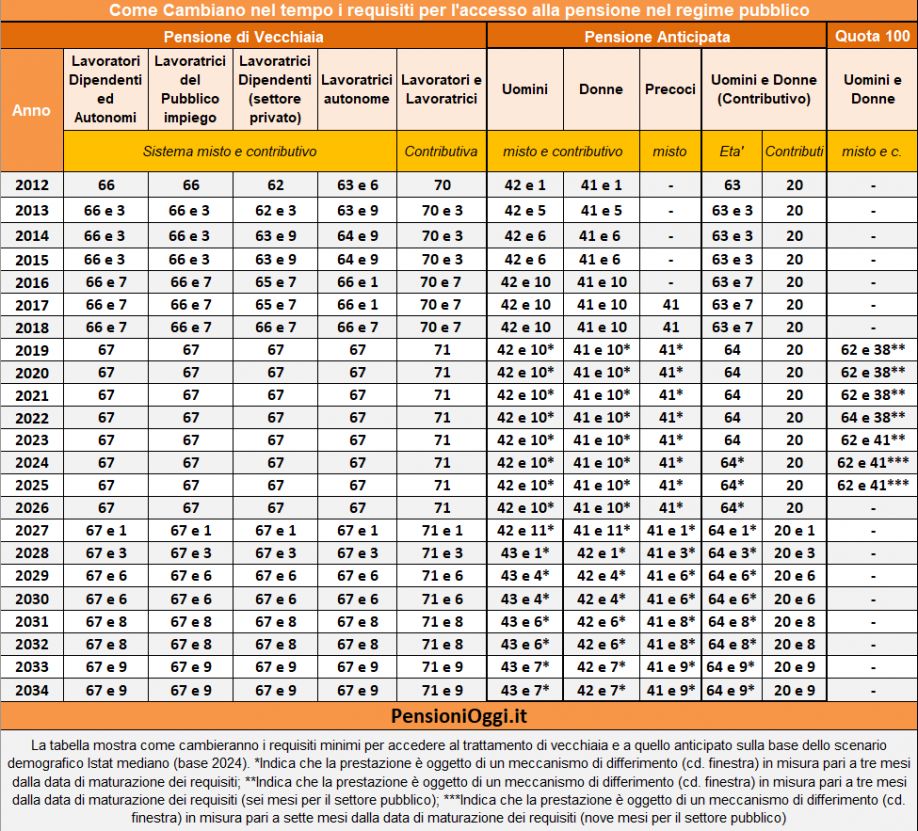 - 58 anni ed un mese di età anagrafica unitamente ad almeno 35 anni di contribuzione dal 1° gennaio 2027; 58 anni e quattro mesi di età anagrafica unitamente ad almeno 35 anni di contribuzione dal 1° gennaio 2028. Resta ferma la finestra mobile di 12 mesi dalla maturazione dei requisiti.