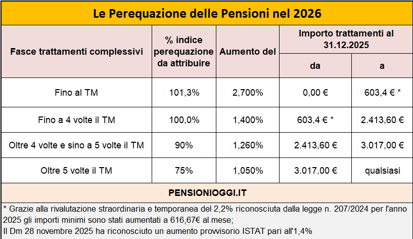 Tecnicamente si chiama perequazione; in pratica, è la rivalutazione annuale degli importi di tutte le pensioni, al fine di adeguarli al costo della vita per proteggere il loro potere d'acquisto, almeno in parte, dall'erosione dovuta all'inflazione. Si applica a tutte le pensioni erogate dal sistema pubblico, sia dirette che ai superstiti (reversibilità e indiretta), nonché alle prestazioni d'invalidità civile e all'assegno/pensione sociale. L'aggiornamento delle pensioni avviene a gennaio di ogni anno, in base all'indice provvisorio e salvo successivo conguaglio, sempre a gennaio, in base all'indice definitivo. Nel 2026 non c’è alcun conguaglio tra l’indice provvisorio e quello definitivo (+0,8%), pertanto dal 1° gennaio 2026 gli assegni vanno rivalutati solo al tasso provvisorio 2026 (+1,4%) stabilito dal decreto del ministero del lavoro 28 novembre 2025.