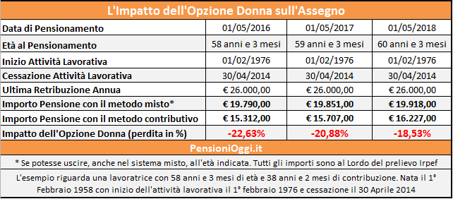 Con le recenti modifiche si è ripristinato lo spirito della norma originaria che prevedeva, tra le condizioni di accesso al regime, il possesso dei suddetti requisiti entro e non oltre il 31 dicembre 2015. Questo significa che le lavoratrici dipendenti devono aver raggiunto i requisiti prescritti (57 anni e 3 mesi e 35 anni di contributi) entro il 31 Dicembre 2015 (58 anni e 3 mesi le autonome). Per questa forma di pensione si ricorda che resta però in vigore il regime della finestra secondo cui l'assegno non viene erogato il mese successivo alla maturazione dei requisiti ma dopo un periodo pari a 12 mesi per le dipendenti e 18 mesi per le autonome.
