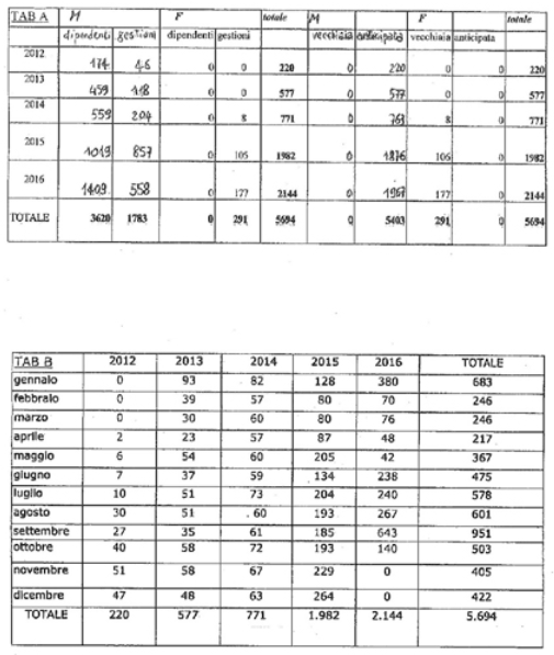 Il sottosegretario al welfare ha precisato che attualmente, le pensioni liquidate ai lavoratori dipendenti nel settore privato, ai sensi dell'articolo 24, comma 5-bis, del decreto-legge n. 201 del 2011, convertito, con modificazioni, dalla legge n. 214 del 2011, per il periodo dal 2012 al 2016, sono 5.694 di queste 2.074 si riferiscono ai lavoratori che erano stati in precedenza (anteriormente al 28 dicembre 2011) iscritti nelle gestioni autonome; 291 riguardano lavoratori di sesso femminile; 5403 sono pensioni anticipate e 291 pensioni di vecchiaia. Per quanto concerne la ripartizione, per anno di decorrenza, dei trattamenti liquidati per il periodo dal 2012 al 2016, l'istituto ha precisato che: nel 2012 sono stati liquidati 220 trattamenti; nel 2013 sono stati liquidati 577 trattamenti; nel 2014 sono stati liquidati 771 trattamenti; nel 2015 sono stati liquidati 1.982 trattamenti; nel 2016 sono stati liquidati 2.144 trattamenti. Ad ogni modo, per una distinzione più dettagliata relativa a ciascun singolo mese il Sottosegretario ha prodotto la tabella sotto allegata. Da ultimo, l'INPS ha reso noto che gli oneri sostenuti per le pensioni liquidate per il periodo dal 2012 al 2016 (compreso il rateo di ottobre) sono complessivamente a 229 milioni di euro. Si tratta di numeri non definitivi, naturalmente, posto che la maggior parte degli aventi diritto maturerà il requisito anagrafico dei 64 anni e 7 mesi il prossimo anno (bisogna considerare, infatti, che il requisito deve essere incrementato per effetto della speranza di vita).