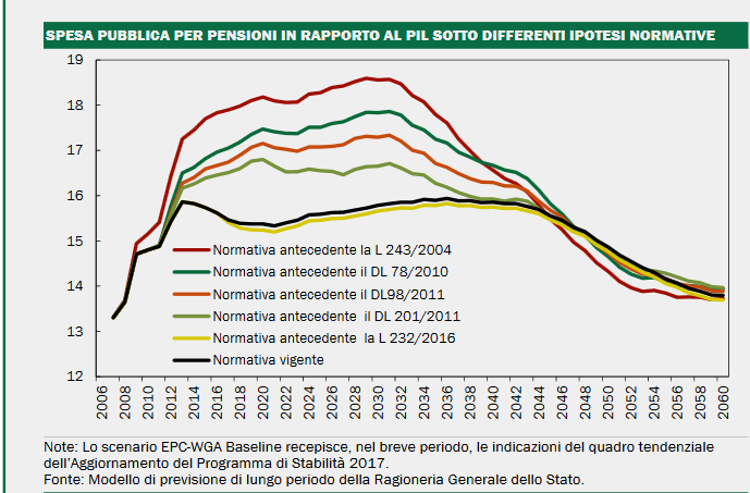 "Cumulativamente la minore incidenza della spesa in rapporto al PIL derivante dal complessivo processo di riforma avviato nel 2004 ammonta a circa 60 punti percentuali del PIL fino al 2050. Tale effetto è da ascrivere per circa il 1/3 alla riforma introdotta con la L. n. 214/2011 e, per la restante quota agli altri interventi. Al netto delle misure approvate con la Legge di Bilancio 2017, tutti i precedenti interventi di riforma, dal 2004 in poi, hanno comportato effetti strutturali e determinato, complessivamente, una progressiva riduzione dell’incidenza della spesa pensionistica in rapporto al PIL rispetto alle previsioni a legislazione previgente, impattando pertanto sul valore attuale dei flussi di spesa attesi" conclude il DEF.