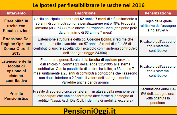 La soluzione senza costi per lo Stato - teoricamente - si chiama ricalcolo contributivo dell'intera pensione: una possibilità che penalizza in modo rilevante il lavoratore (la decurtazione del trattamento previdenziale, che dipende dalla carriera del singolo, si aggira sul 15-20 per cento ma può arrivare fino al 30) ma in realtà pone comunque qualche problema finanziario al bilancio pubblico, almeno nell'immediato. Questa possibilità già esiste per le lavoratrici e, dunque, si potrebbe prorogarla nei confronti di tutti i lavoratori con un ritocco ai requisiti anagrafici e contributivi per l'ingresso. Andando oltre il 2015, sino al 2018, oppure rendendola strutturale. Da valutare anche l'ipotesi del prestito pensionistico che avrebbe un impatto minore sui conti pubblici ma interesserebbe una platea ristretta di lavoratori. Un meccanismo rischioso, ha messo in guardia il Ministro del Lavoro Poletti, perchè andrebbe ad incidere su platee i cui assegni sono già molto bassi compromettendo il loro potere d'acquisto in modo definitivo.
